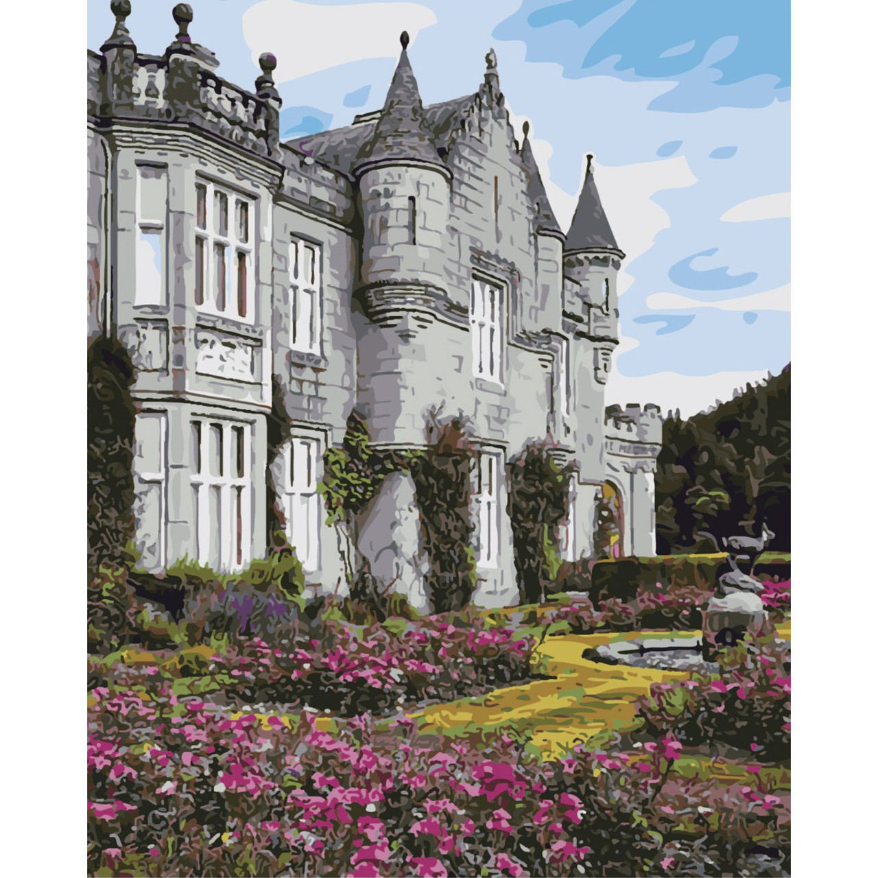 Картина за номерами Strateg ПРЕМІУМ Квіти перед замком з лаком та рівнем розміром 40х50 см SY6516