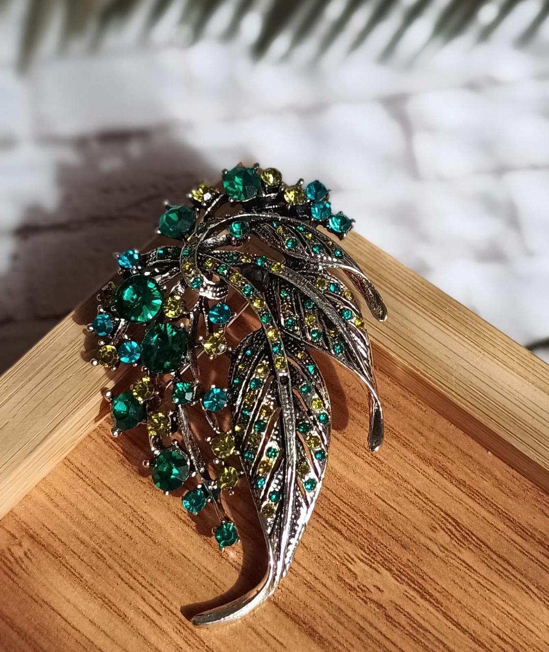 Брошка Смарагдовий каскад – уособлення елегантності та натхнення природою. Вишукане поєднання сріблястого металу та сяючих кристалів насичених зелених і золотистих відтінків надає аксесуару благородний та витончений вигляд. Листя з гравіюванням створюють ефект плавного каскаду, а переливчасті камені додають динаміки образу.